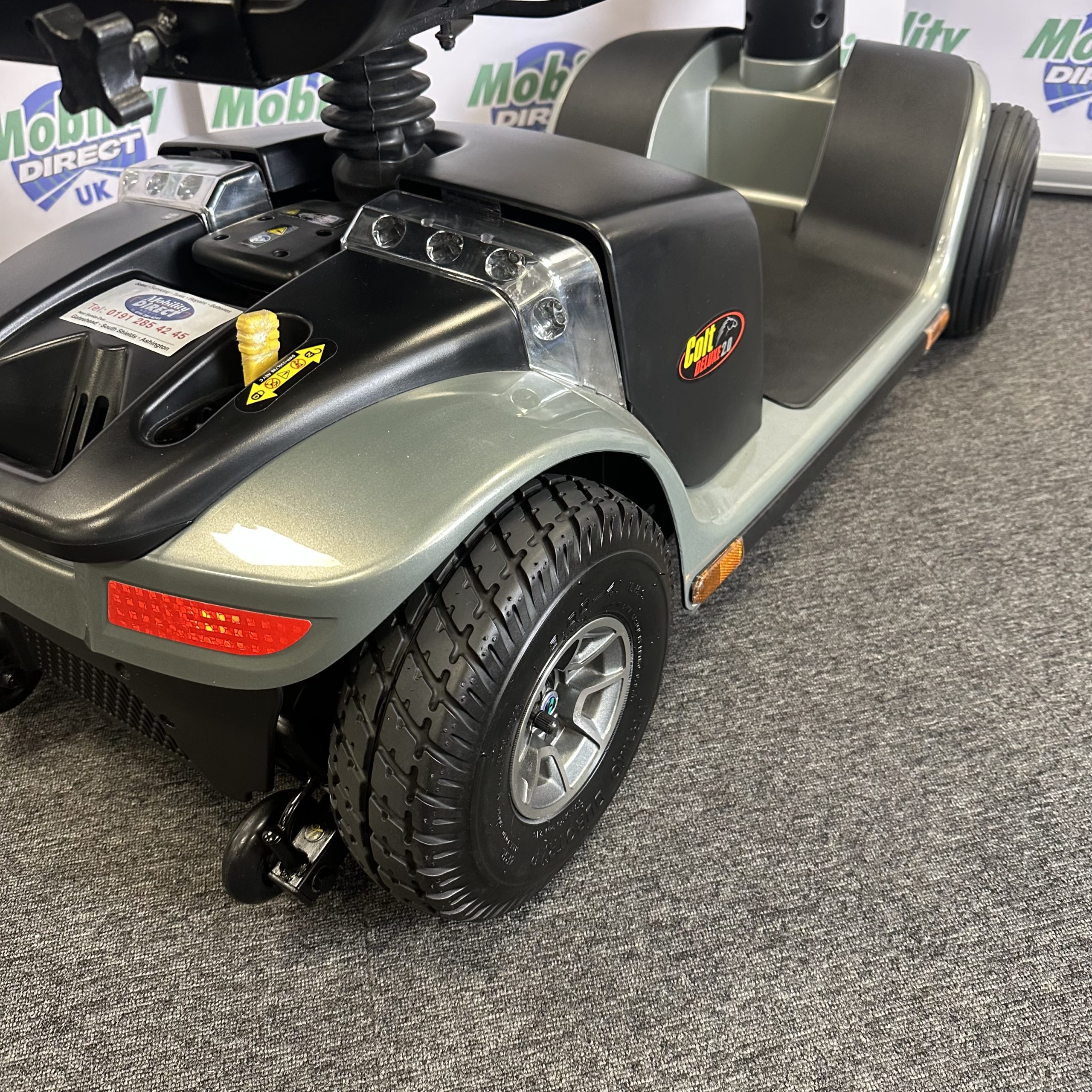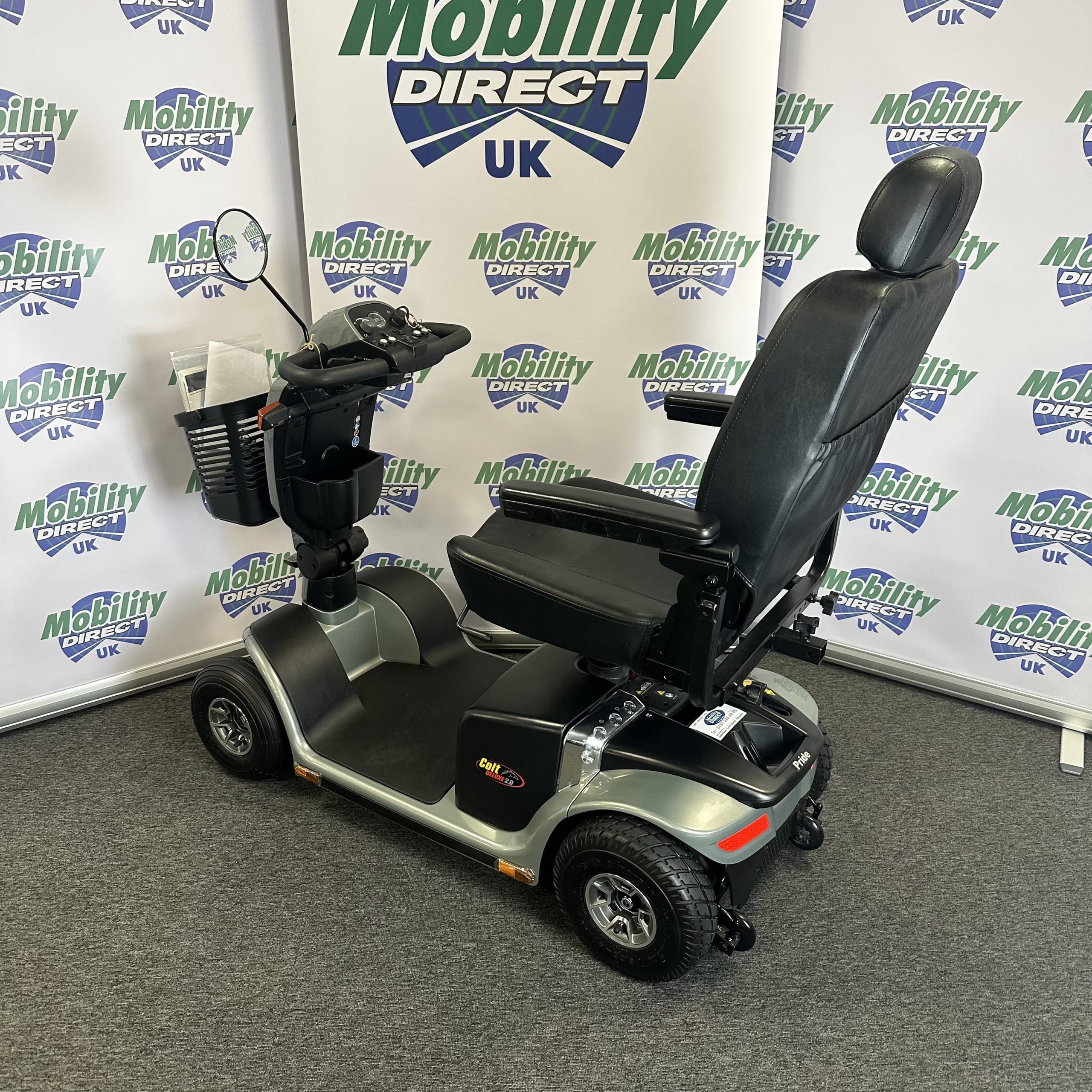 The front and rear end of the Colt Deluxe 2.0 has high powered LED lights which will help illuminate the way should you decide on a late night/early morning ride. Being a road legal mobility scooter the Pride Colt Deluxe 2.0 also come with indicators to make others aware of which way you are going, hazard lights should you break down and a wing mirror for full visibility behind.